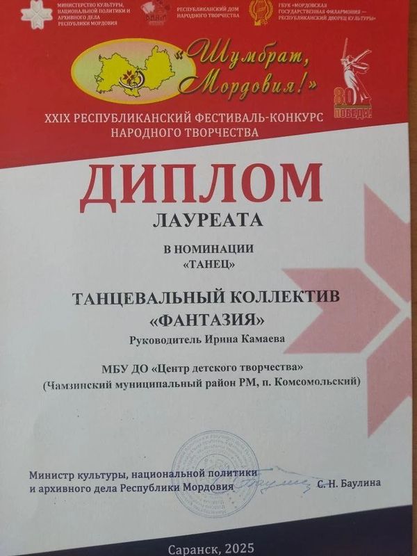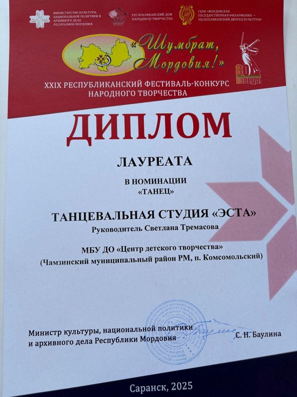 По итогам фестиваля, танцевальные студии «Фантазия» (рук. Камаева И.М.) и «ЭСТА» (рук. Тремасова С.А.) получили заслуженные Дипломы Лауреата в номинации «Танец» за свое неповторимое творческое исполнение.