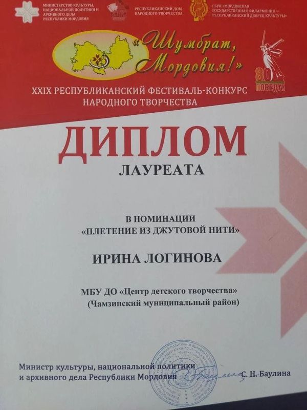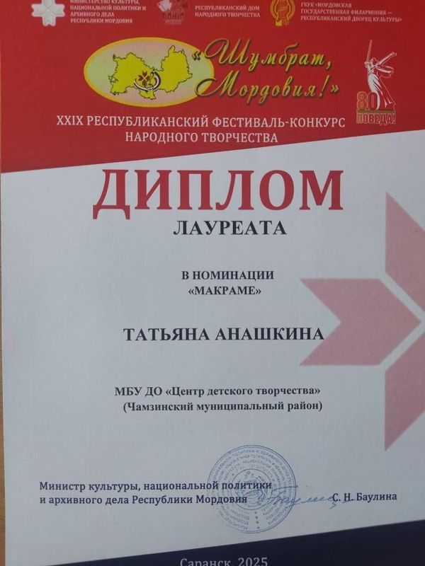 За высокое профессиональное мастерство Дипломами Лауреата фестиваля отмечены педагоги ЦДТ: Логинова И.М. (номинация «Плетение из джутовой нити») и Анашкина Т.А. (номинация «Макраме»).